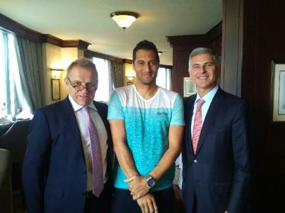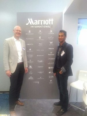 Catching up with the worlds most well known Hotel CEO ( and President of WTTC) Mr. Chris Nassetta ( right ) and VP Mr. Simon Vincent ( Left ) from Hilton Worldwide during a lounge morning of the start of the Africa Hotel Conference in Kenya, October, 2018.